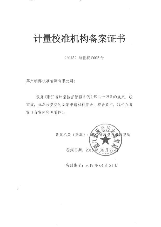 我司已通過浙江省計(jì)量校準(zhǔn)機(jī)構(gòu)備案有效期至2019年4月2日。朗博校準(zhǔn)檢測(cè)有限公司(簡(jiǎn)稱朗博實(shí)驗(yàn)室)是...