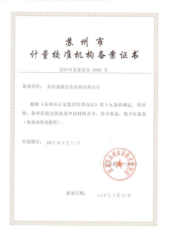 蘇州市計(jì)量校準(zhǔn)機(jī)構(gòu)備案證書